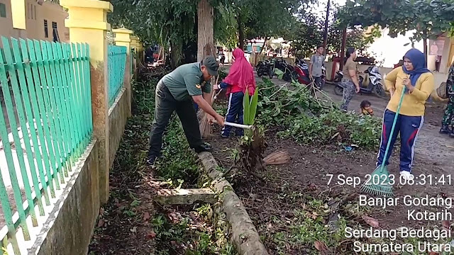 Babinsa Koramil 0204-17/Kotarih, Sertu Hartono bekerjasama dengan warga melakukan pembersihan drainase di Desa Kotarih, Kecamatan Kotarih, Kabupaten Serdang Bedagai,