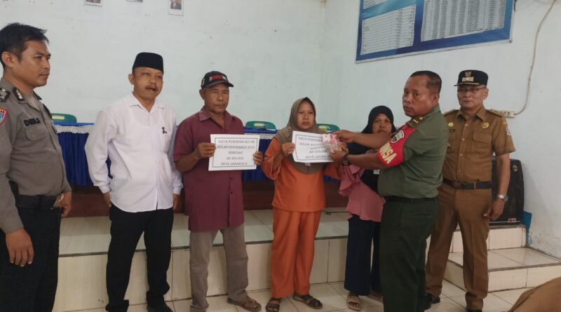 Tampak Pelda Tukidi didampingi Kepala Desa Jaharun B, Jarno, Bhabinkamtibmas Jaharun B, Bripka Dedi, Pendamping Desa Jaharun B, Perangkat Desa Jaharun B dan BPD Desa Jaharun B, secara simbolis memberikan BLT kepada warga.
