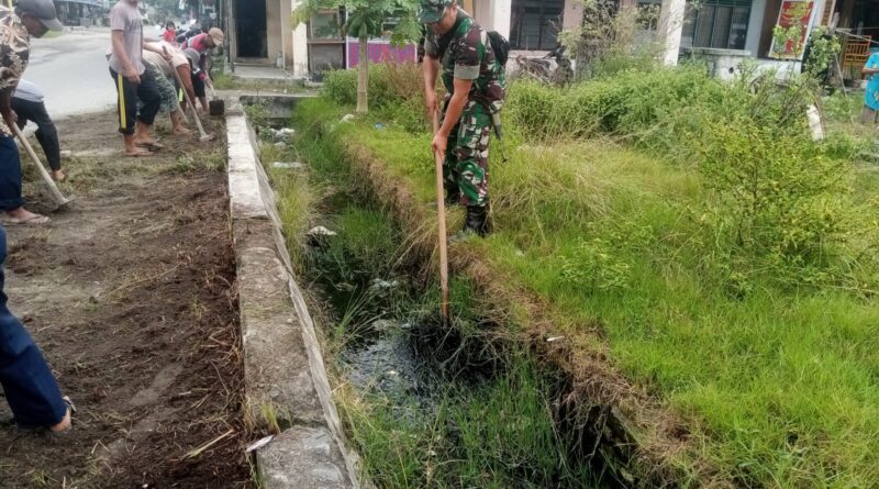 Babinsa Koramil-08/PC, Kodim DS bersama warga Desa Lubuk Saban melaksanakan kegiatan tanggap bencana (Tagana) dengan bergotong royong membersihkan dan pengorekan saluran parit yang Tumpat,