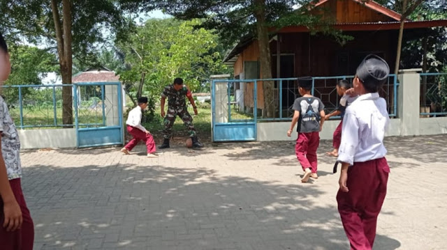 ” Saya mengajak para siswa SD olah raga pagi main bola agar tubuh selalu sehat untuk menunjang kegiatan belajar. dihalaman sekolah,” ujar Sertu Suparmin.