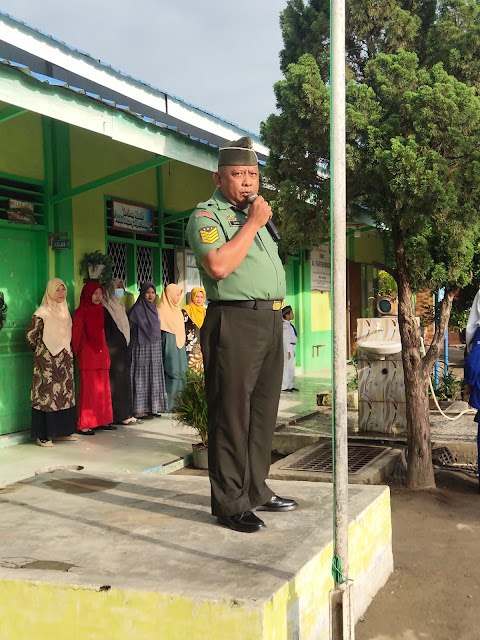 Serma Suriadi bertindak sebagai pembina upacara yang diikuti para pelajar dan guru guru sekolah Yayasan Alfazar.