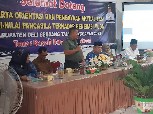 Ajakan itu disampaikan Kasdim saat tampil menjadi pemateri dalam acara Orientasi dan Pengayaan Aktualisasi Nilai-Nilai Pancasila Terhadap Generasi Muda TA 2023 yang digelar di Aula SMAN 1 Sunggal, Jl Sei Mencirim,  Desa Sei Semayang, Senin (18/12/2023).