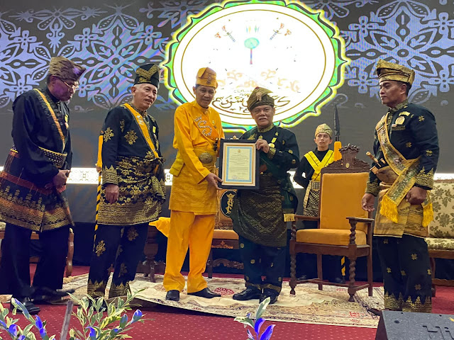 Prosesi penganugerahan gelar adat yang dilangsungkan di Convention Hall Jl Negara, Kelurahan Petapahan, Kecamatan Lubukpakam, Jumat malam (22/12/2023) kemarin, dipimpin langsung Sultan Deli XIV, Duli Yang Mulia Seripaduka Tuanku Sultan Mahmud Arya Lamantjiji Perkasa Alam Shah atau Tuanku Aji.