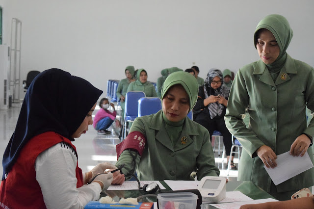 Ketua Persit KCK Cabang XXXIII Dim 0204 Koorcabrem 022 PD I/BB, Ny Deasyanthy Alex Sandri menjalani pemeriksaan untuk menjadi peserta donor darah peringatan HUT ke-78 Persit KCK.